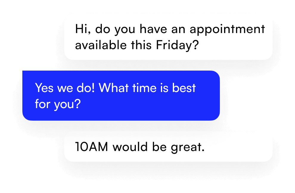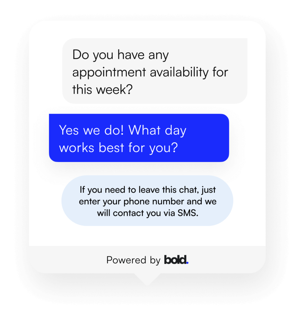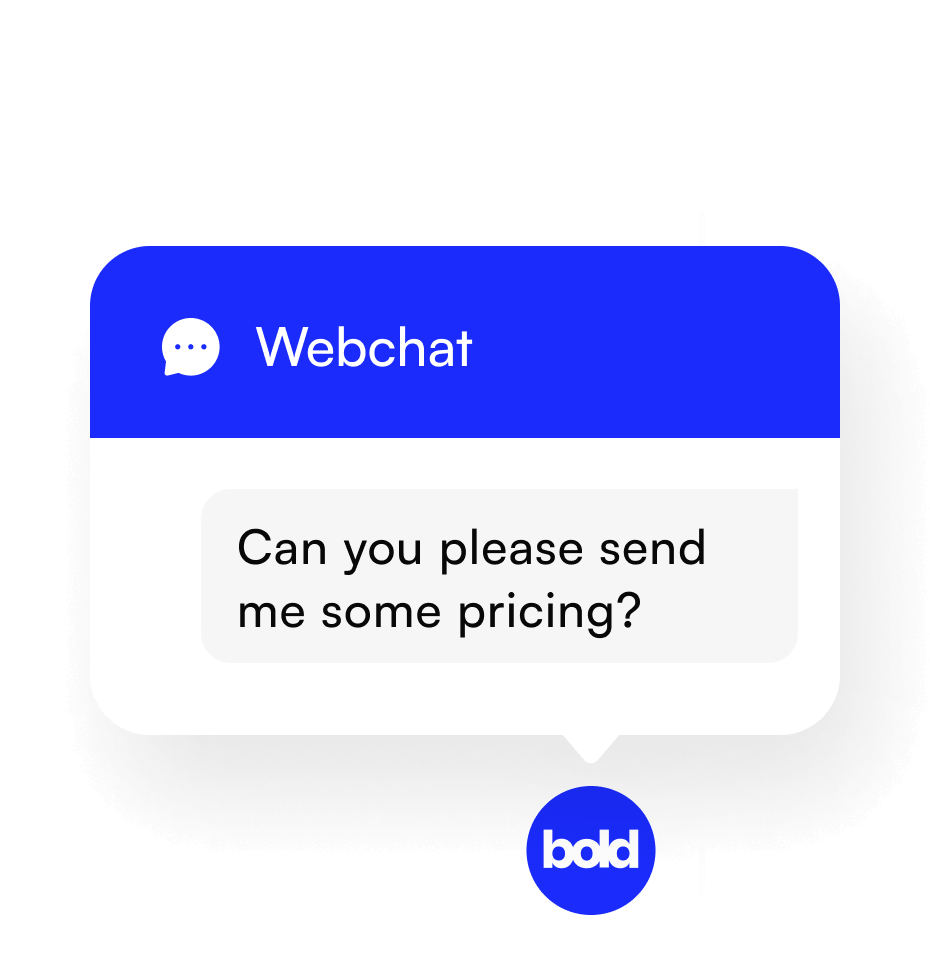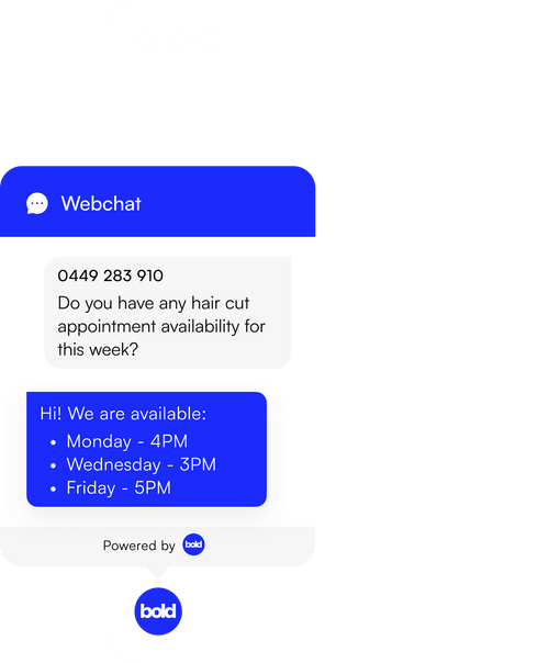 Webchat Turn more visitors into customers Bold webchat is not your typical chat widget, it’s a chat-to-sms system that converts more browsers into customers by keeping the conversation going long after they have left your website. Contact Sales Get Started The chat doesn't end when they leave your website. Convert more leads into customers by continuing the webchat over SMS so you close the deal while your leads are hot. Whether its appointment bookings, or general questions be instant to respond, and quick to close. Get Started Contact Sales Message your way to more revenue. Chat with customers, book appointments, send payment requests and close more deals all in the same conversation. Allow Bold AI to automatically book appointments during or after hours using conversational messaging. Get Started Contact Sales Tag and assign conversations. Tag contacts and conversations, segment contacts based on tags, and easily assign conversations to different staff members. Build automations and campaigns based on tags and conversations. Get Started Contact Sales Message your way to more revenue. Chat with customers, book appointments, send payment requests and close more deals all in the same conversation. Allow Bold AI to automatically book appointments during or after hours using conversational messaging. Get Started Contact Sales Track customer interaction. See the complete history of a lead or customer’s interaction with your website, social channels, calls, sms and email. Get Started Contact Sales All the features you need to boost your online reviews. AI Intelligence Use AI conversational messaging to automatically book appointments for you. Intelligent Responses Automatically answer common questions, such as opening hours, availability and FAQ. Multi-platform Keep the conversation going on desktop, tablet or the Bold mobile app. Leaderboard View staff response times and closing rates at a glance. Auto Responder Automatically capture a leads name and phone number on every chat. Want instant access to your new messaging platform? Get Started Contact Sales Our Platform Bookings Automatically book leads into your calendar. Manage availability and organise your team. Use Bold AI to automate appointments. Inbox Merge your email, SMS and social media messages into one unified inbox. Never miss client communication again. Web Chat Use our chat-to-sms widget to keep the conversation going long after the customer has left your website. Reviews Generate reviews automatically and at rapid pace. Easily filter out negative or 1-star reviews and rank at the top of Google. Payments Make it easy for customers to purchase your product or service. Send invoices, keep track of what’s unpaid and get paid faster. Campaigns Leverage high converting SMS campaigns. Use Bold AI to message the customer based on their interaction with your business.